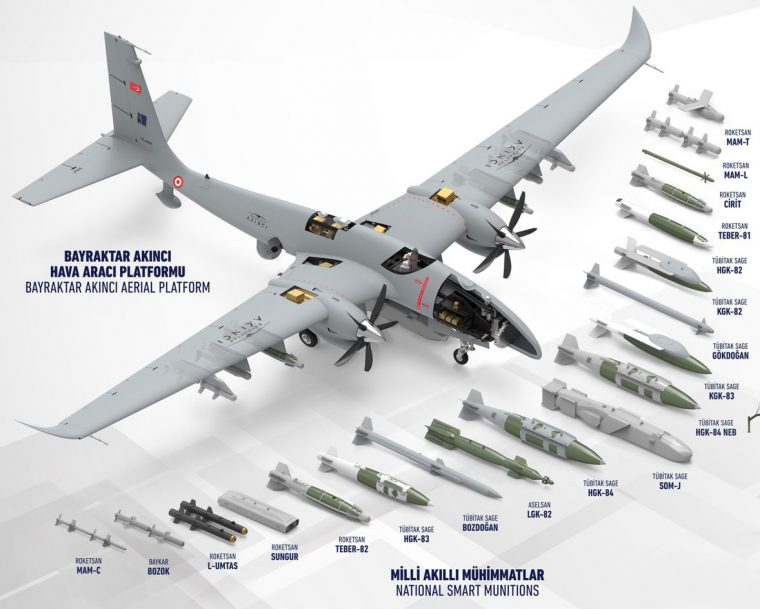 Görev gereklerine göre 2 adet KGK-MK-82, 2 adet Teber-81, 8 adet MAM-C’yle donatılabilecek Akıncı, ayrıca başka bir konfigürasyonda aynı anda 2’şer adet Teber-81, TÜBİTAK SAGE tarafından geliştirilen ilk milli hava füzelerinden Gökdoğan ile görev yapabilecek.